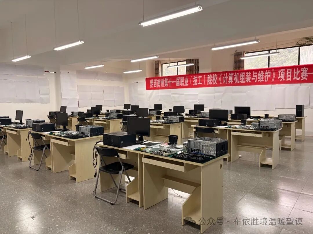 在计算机组装与维护的赛场上,12名选手面前井然有序地摆放着主机、显示器、键盘等设备部件。选手们正聚精会神地进行组装操作,每一个步骤都严格考验着他们的熟练程度和精确度。