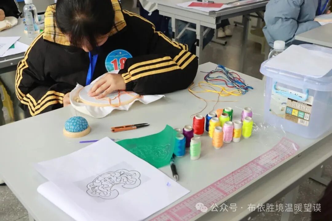 另一栋教学楼的刺绣比赛现场,24名女选手端坐在绣架前,手中针线穿梭,彩线在布面上渐渐勾勒出精美的图案。
